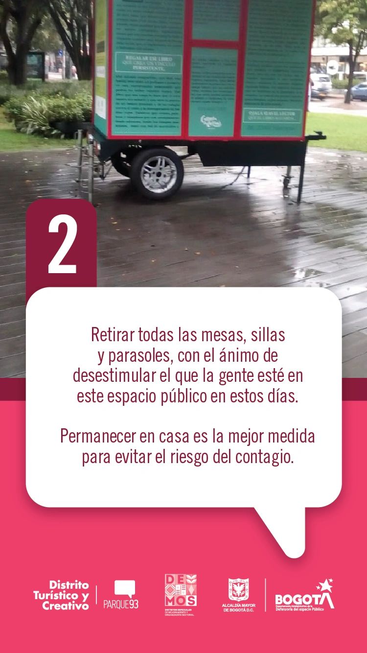 2. Retirar todas las mesas, sillas y parasoles, con el ánimo de desestimular el que la gente esté en este espacio público en estos días. Permanecer en casa es la mejor medida para evitar el riesgo del contagio.