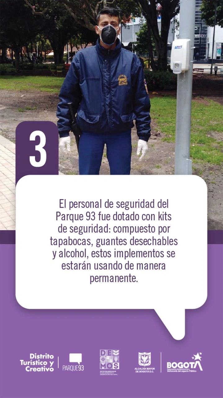 3. El personal de seguridad del Parque 93 fue dotado con kits de seguridad: compuesto por tapabocas, guantes desechables y alcohol, estos implementos se estarán usando de manera permanente.